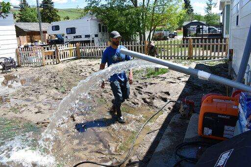 Micah Hoffman is seen in his mud-covered yard as a pump removes water from his basement, Tuesday June 14, 2022, in Red Lodge, Mont. Residents were cleaning up after record floods in southern Montana this week. (AP Photo/Matthew Brown)