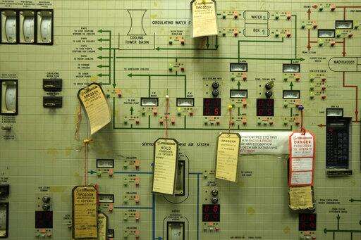 Notes hang at the control room of a power plant outside the northern city of Kozani on Friday, June 3, 2022. Energy market turmoil caused by the war in Ukraine has triggered an increase in coal-fired electricity production in the European Union and a temporary slowdown in the closure of power plants long-earmarked for retirement. (AP Photo/Thanassis Stavrakis)