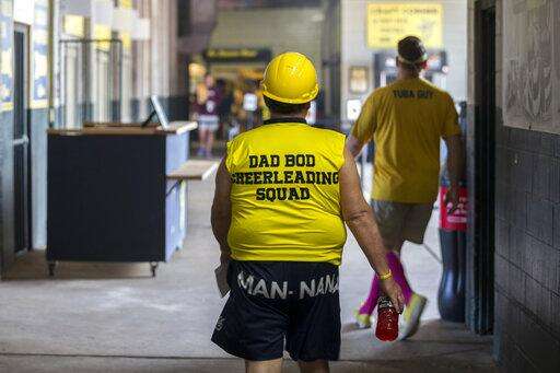 Marty Jones, one of the original members of the Savannah Bananas' Man-Nana Dad Bod Cheerleading Squad, walks beneath the stadium after a meeting before the team's game against the Florence Flamingos, Tuesday, June 7, 2022, in Savannah, Ga. (AP Photo/Stephen B. Morton) The Associated Press