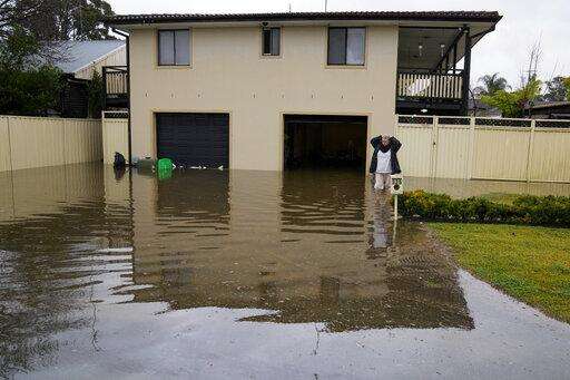 A woman stands in her flooded front yard of her home at Windsor on the outskirts of Sydney, Australia, Tuesday, July 5, 2022. Hundreds of homes have been inundated in and around Australia's largest city in a flood emergency that was threatening 50,000 people, officials said on Tuesday. (AP Photo/Mark Baker)