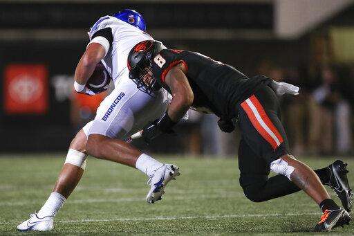 Boise State tight end Riley Smith (3) slips a tackle by Oregon State linebacker Kyrei Fisher-Morris (8) during the second half of an NCAA college football game Saturday, Sept. 3, 2022, in Corvallis, Ore. Oregon State won 34-17. (AP Photo/Amanda Loman) The Associated Press