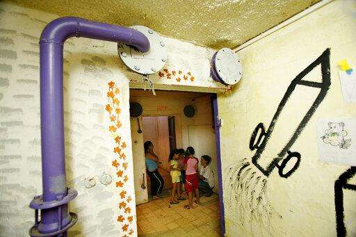 FILE - Israelis gather in a shelter during a rocket attack by Hezbollah guerillas in the northern Israeli town of Kiryat Shmona, Thursday, Aug. 3, 2006. (AP Photo/Oded Balilty, File) The Associated Press