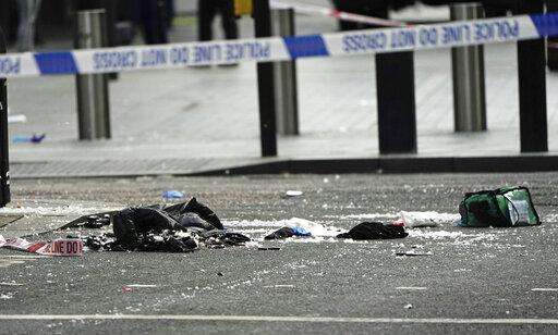 Items in the street at the scene in Shaftesbury Avenue, where two male police officers were stabbed, in London, Friday, Sept. 16, 2022. London's police force says two officers have been hospitalized after being stabbed in central London early Friday. It says the attack is not being treated as terrorism. The Metropolitan Police force says officers 'encountered a man with a knife' in the Leicester Square area, a busy tourist hub, at around 6 a.m. (Aaron Chow/PA via AP)