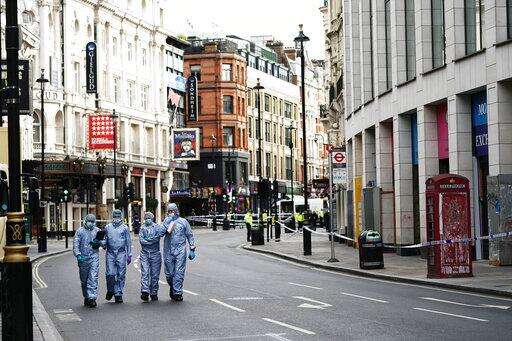 LONDON (AP) - Two London police officers were hospitalized after being stabbed in the city's busy West End on Friday, the Metropolitan Police force said. The attack is not being treated as terrorism.