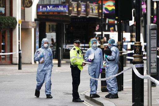 Forensics officers and police at the scene in Shaftesbury Avenue, where two male police officers were stabbed, in London, Friday, Sept. 16, 2022. London's police force says two officers have been hospitalized after being stabbed in central London early Friday. It says the attack is not being treated as terrorism. The Metropolitan Police force says officers 'encountered a man with a knife' in the Leicester Square area, a busy tourist hub, at around 6 a.m. (Aaron Chow/PA via AP)