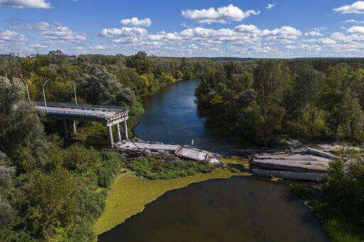 A view on destroyed bridge across Siverskiy-Donets river in the recently retaken area of Izium, Ukraine, Monday, Sept. 19, 2022. Residents of Izium, a city recaptured in a recent Ukrainian counteroffensive that swept through the Kharkiv region, are emerging from the confusion and trauma of six months of Russian occupation, the brutality of which gained worldwide attention last week after the discovery of one of the world's largest mass grave sites. (AP Photo/Evgeniy Maloletka)