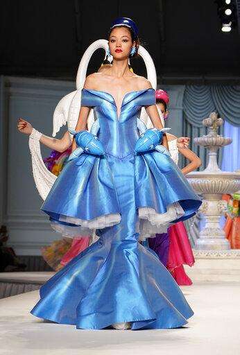 A long black dress featured a sexy criss-cross halter anchored by big red hearts, and a bright pink wrap cocktail dress was paired with heels graced with curving flamingos. An elaborate mermaid dress in ocean blue sported two hip bustles with inflatable dolphins riding the waves, while an inflatable swan lent drama to a white Grecian dress.