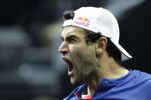 Team Europe's Matteo Berrettini, of Italy, celebrates after winning a match against Team World's Felix Auger-Aliassime, of Canada, on second day of the Laver Cup tennis tournament at the O2 in London, Saturday, Sept. 24, 2022. (AP Photo/Kin Cheung) The Associated Press