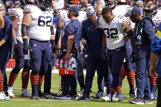 Chicago Bears running back David Montgomery (32) is helped off the field during the first half of an NFL football game against the Houston Texans Sunday, Sept. 25, 2022, in Chicago. (AP Photo/Nam Y. Huh) The Associated Press