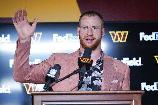 Washington Commanders quarterback Carson Wentz (11) gesturing during his news conference after and an NFL football game against the Philadelphia Eagles, Sunday, Sept. 25, 2022, in Landover, Md. Eagles won 24-8. (AP Photo/Alex Brandon)