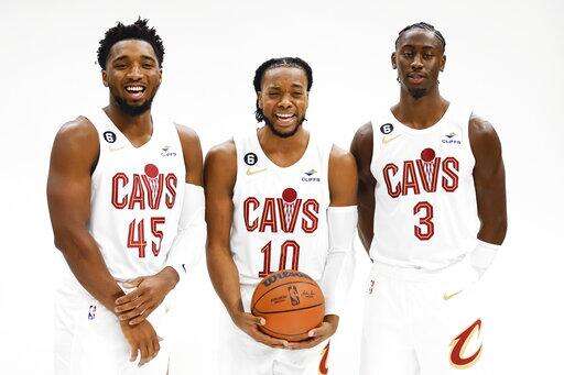 Cleveland Cavaliers guard Donovan Mitchell (45), Darius Garland (10) and Caris LeVert (3) pose for a portrait during the NBA basketball team's media day, Monday, Sept. 26, 2022, in Cleveland. (AP Photo/Ron Schwane) The Associated Press
