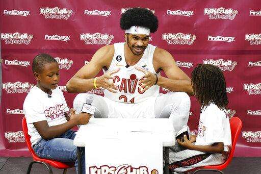 Cleveland Cavaliers center Jarrett Allen gets interviewed by Kids Club members during the NBA basketball team's media day, Monday, Sept. 26, 2022, in Cleveland. (AP Photo/Ron Schwane) The Associated Press