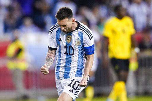 Argentina's player Lionel Messi celebrates his goal during the second half of an international friendly soccer match against Jamaica on Tuesday, Sept. 27, 2022, in Harrison, N.J. (AP Photo/Eduardo Munoz Alvarez)