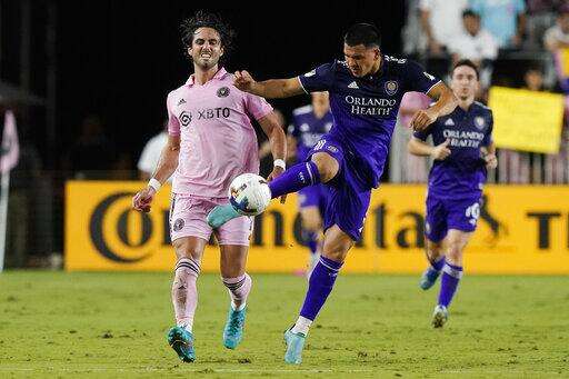 Orlando City midfielder César Araújo (5) attempts to block Inter Miami midfielder Bryce Duke (22) during the second half of an MLS soccer match, Wednesday, Oct. 5, 2022, in Fort Lauderdale, Fla. (AP Photo/Marta Lavandier)