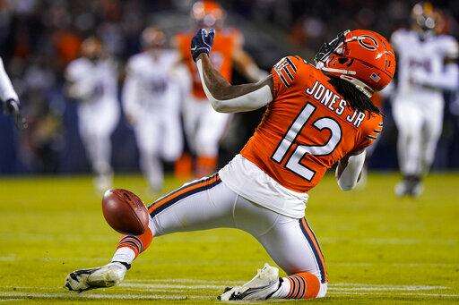 Chicago Bears wide receiver Velus Jones Jr. fumbles a punt in the second half of an NFL football game against the Washington Commanders in Chicago, Thursday, Oct. 13, 2022. The Commanders recovered the ball. (AP Photo/Nam Y. Huh) The Associated Press