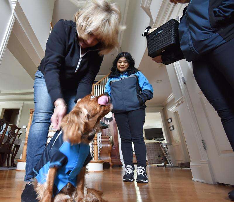Mr. Baloo licks his lips as owner Karen Nuzzo dresses him in a new Amazon uniform as delivery drivers Dayanara Zamora and Lizette Martinez, right, bring him gifts. He is one of three dogs nationwide receiving gifts from Amazon.