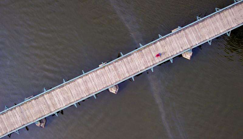 A cyclist in red crosses the footbridge from west to east at Fabyan Forest Preserve Wednesday, August 3, 2022 in Geneva.