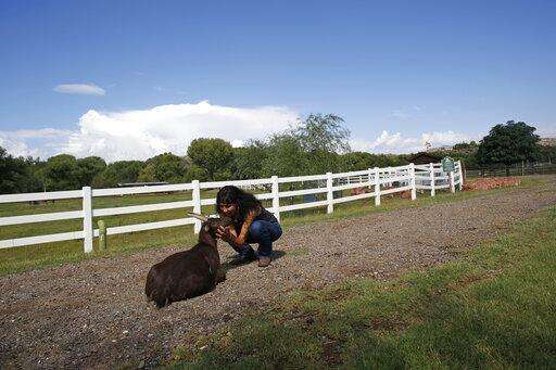Erik Denton interacts with animals at the Selah Carefarm in Cornville, Ariz., Oct. 4, 2022. The 35-year-old repeat visitor is certain he can't ever get over the deaths of his three children last year, but he's functioning again. He does the dishes and makes his bed. He doesn't hole up alone for days at a time. (AP Photo/Dario Lopez-Mills)