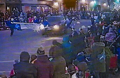 A video of a vehicle driving through the 2021 Waukesha Christmas Parade is shown to jurors during the Darrell Brooks trial in a Waukesha County Circuit Court in Waukesha, Wis., on Thursday, Oct. 20, 2022. Brooks, who is representing himself during the trial, is charged with driving into a Waukesha Christmas Parade last year, killing six people and injuring dozens more. (Scott Ash/Milwaukee Journal-Sentinel via AP, Pool)