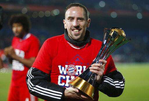 FILE - Bayern's Franck Ribery lifts the trophy after Bayern won the final of the soccer Club World Cup between FC Bayern Munich and Raja Casablanca in Marrakech, Morocco, on Dec. 21, 2013. Former France winger Franck Ribéry ended his 22-year career on Friday, Oct. 21, 2022, because of insurmountable knee problems. The 39-year-old Ribéry, who played for France in the 2006 World Cup final and won the Champions League with Bayern Munich in 2013, announced the decision in a video posted on social media, where the Salernitana player also thanked his family and the fans. (AP Photo/Matthias Schrader)