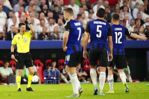 Referee Benoit Bastien shows a red card to Copenhagen's David Khocholava during the Champions League soccer match between Sevilla and Copenhagen at the Ramon Sanchez Pizjuan stadium in Seville, Spain, Tuesday, Oct. 25, 2022. (AP Photo/Jose Breton)