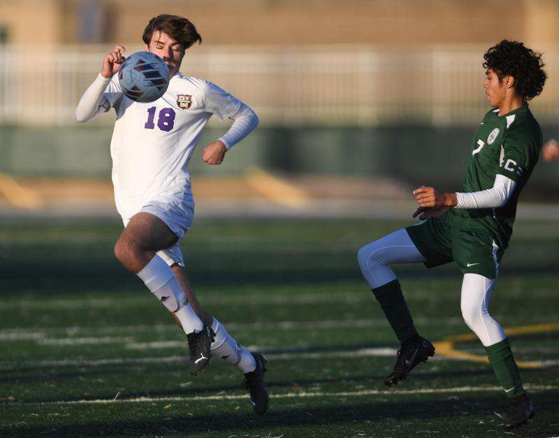 Crystal Lake South's Nicholas Prus heads the ball against Vernon Hills' Charlie Rogers in a Class 2A sectional semifinal boys soccer game in Grayslake on Wednesday, October 26, 2022.