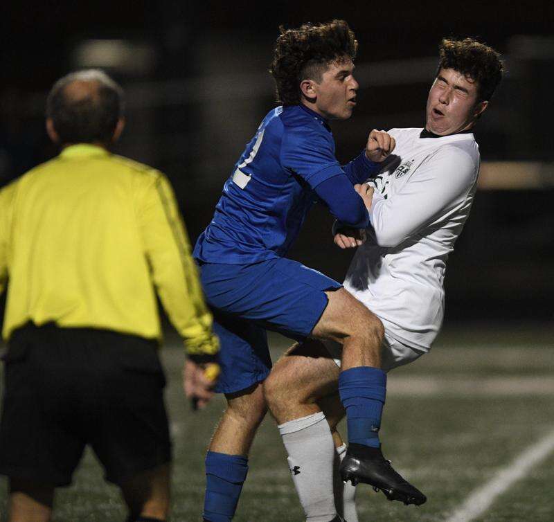 Crystal Lake South's Garrett Hess, right, and Vernon Hills' Charlie Rogers collide as they compete for a header in a Class 2A sectional semifinal boys soccer game in Grayslake on Wednesday, October 26, 2022.