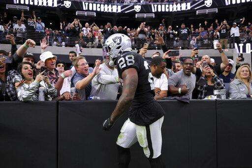 RAIDERS PLAYER TO WATCH: RB Josh Jacobs has rushed for 441 yards and six TDs the past three games. This is just the eighth time since the merger a running back has run for at least 140 yards and a score in three straight games. Jacobs has 523 yards from scrimmage in the past three games, the second most by a Raiders player in a three-game span to Marcus Allen's 576 in 1985. His seven carries of at least 10 yards last week were the most by a Raiders player since at least 1991.