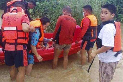 In this handout photo provided by the Philippine Coast Guard, rescuers evacuate residents at a flooded village in Tuguegarao city, Cagayan province, northern Philippines on Sunday Oct. 30, 2022. Victims of a huge mudslide set off by a storm in a coastal Philippine village that had once been devastated by a killer tsunami mistakenly thought a tidal wave was coming and ran to higher ground toward a mountain and were buried alive, an official said Sunday. (Philippine Coast Guard via AP)