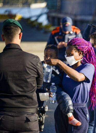 Migrants disembarked from the German humanitarian ship Rise Above docked in the southern Italian port town of Reggio Calabria board a bus, Tuesday, Nov. 8, 2022. German humanitarian group Mission Lifeline said its ship docked in southern Italy early Tuesday and disembarked the 89 people it had rescued in the central Mediterranean. (AP Photo/Valeria Ferraro)