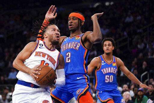 NEW YORK (AP) - Shai Gilgeous-Alexander scored 37 points, Josh Giddey had a triple-double and the Oklahoma City Thunder shot a season-high 62.5% from the field in a 145-135 victory over the New York Knicks on Sunday.
