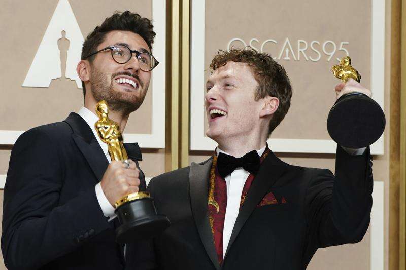 Tom Berkeley, left, and Ross White pose with the award for best live action short film for "An Irish Goodbye" in the press room at the Oscars on Sunday, March 12, 2023, at the Dolby Theatre in Los Angeles. (Photo by Jordan Strauss/Invision/AP)
