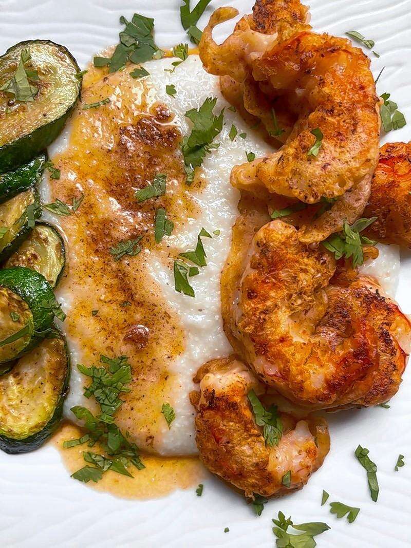 To plate: Pour the grits in the middle of the plate. Add the zucchini on the side. Add the cooked shrimp. Add the teaspoon of butter to the pan with ¼ teaspoon Nashville Hot seasoning and pour over grits.