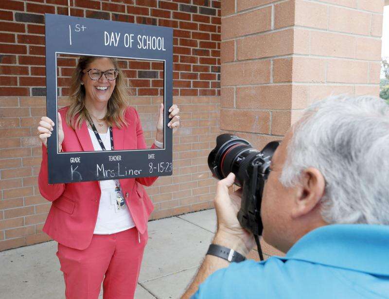 Kindergarten teacher Somya Bergman greets some of her students on the first day of school at Louise White Elementary in Batavia on Wednesday, Aug. 16, 2023.