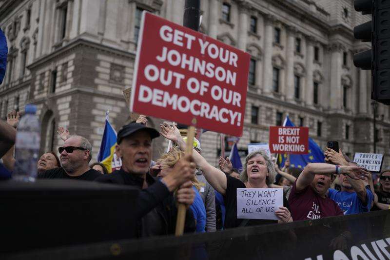 FILE - Anti-Brexit protesters sing to music standing on a traffic island across the street from the Houses of Parliament, in London, Wednesday, June 29, 2022. Britain is one of the world's oldest democracies, but some worry that essential rights and freedoms are under threat. They point to restrictions on protest imposed by the Conservative government that have seen environmental activists jailed for peaceful but disruptive actions. (AP Photo/Matt Dunham, File) (AP Photo/Matt Dunham, File)
