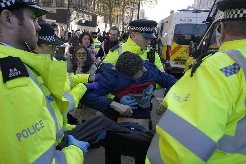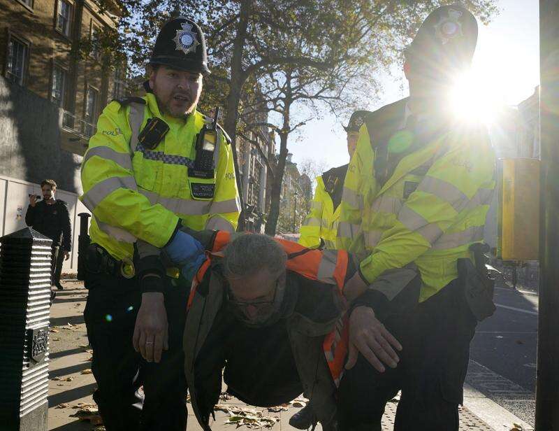 Police arrests protesters of the climate campaigners group Just Stop Oil in London, Thursday, Nov. 23, 2023. Britain is one of the world's oldest democracies, but some worry that essential rights and freedoms are under threat. They point to restrictions on protest imposed by the Conservative government that have seen environmental activists jailed for peaceful but disruptive actions. (AP Photo/Frank Augstein) (AP Photo/Frank Augstein)