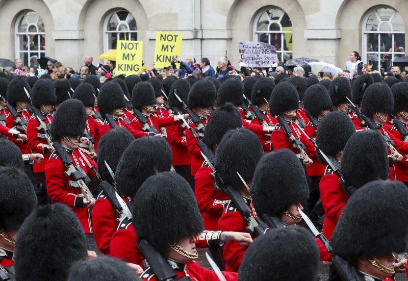 FILE- Grenadier Guards march past protesters demonstrate during the coronation ceremony of King Charles III at Westminster Abbey, London, Saturday May 6, 2023.Britain is one of the world's oldest democracies, but some worry that essential rights and freedoms are under threat. They point to restrictions on protest imposed by the Conservative government that have seen environmental activists jailed peaceful but disruptive actions. (Violeta Santos Moura/Pool Photo via AP, File) (Violeta Santos Moura/Pool Photo via AP, File)