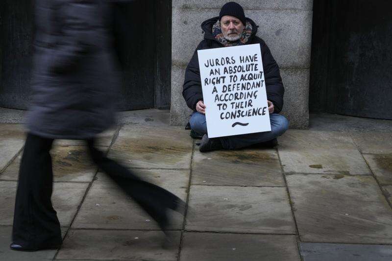 A demonstrator holds a banner outside The Old Bailey, the Central Criminal Court of England and Wales, in London, Monday, Dec. 4, 2023. An estimated 500 people are expected to gather outside Crown Courts nationwide to protest. Britain is one of the world's oldest democracies, but some worry that essential rights and freedoms are under threat. They point to restrictions on protest imposed by the Conservative government that have seen environmental activists jailed for peaceful but disruptive actions. (AP Photo/Kirsty Wigglesworth) (AP Photo/Kirsty Wigglesworth)
