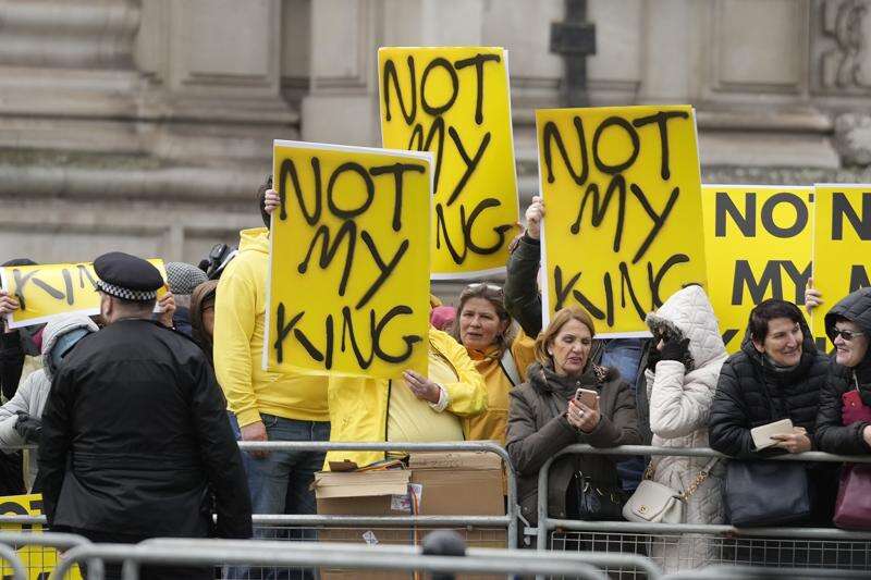 FILE -Protesters hold placards with the message "Not my king" before Britain's King Charles III arrives to attend the annual Commonwealth Day service at Westminster Abbey in London, Monday, March 13, 2023. Britain is one of the world's oldest democracies, but some worry that essential rights and freedoms are under threat. They point to restrictions on protest imposed by the Conservative government that have seen environmental activists jailed for peaceful but disruptive actions. (AP Photo/Frank Augstein, File) (AP Photo/Frank Augstein, File)