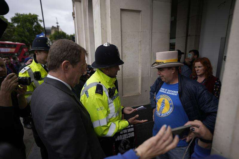 FILE-A police officer speaks to anti-Brexit protester Steve Bray, with Bray supporter Alastair Campbell, the press officer to former British Prime Minister Tony Blair, at left, near the Houses of Parliament, in London, Wednesday, June 29, 2022. Britain is one of the world's oldest democracies, but some worry that essential rights and freedoms are under threat. They point to restrictions on protest imposed by the Conservative government that have seen environmental activists jailed for peaceful but disruptive actions. (AP Photo/Matt Dunham, File) (AP Photo/Matt Dunham, File)