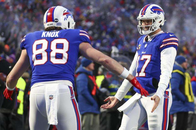 Buffalo Bills quarterback Josh Allen (17) and tight end Dawson Knox (88) celebrate after a touchdown against the Pittsburgh Steelers during the first quarter of an NFL wild-card playoff football game, Monday, Jan. 15, 2024, in Buffalo, N.Y. (AP Photo/Jeffrey T. Barnes) (AP Photo/Jeffrey T. Barnes)