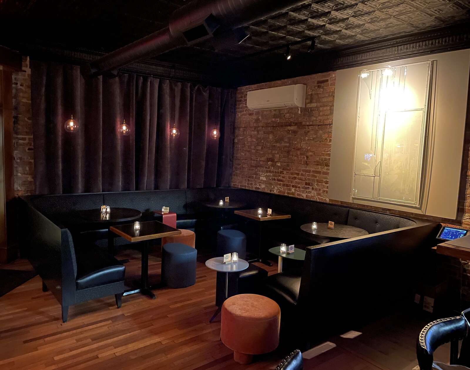 The new art and vinyl lounge takes the place of the front dining room, and features a mix of different size and shaped tables and stools that can be arranged in different configurations, along with three walls of banquette/booth seating on the edges.