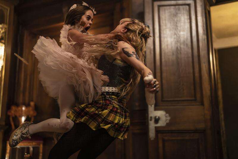 Abigail (Alisha Weir) shows Sammy (Kathryn Newton) no mercy in “Abigail.” Courtesy of Universal Pictures