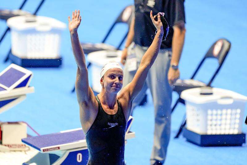 In the night's other final, Bobby Finke earned the right to defend the 800 freestyle gold he won in Tokyo with a time of 7 minutes, 44.22 seconds.