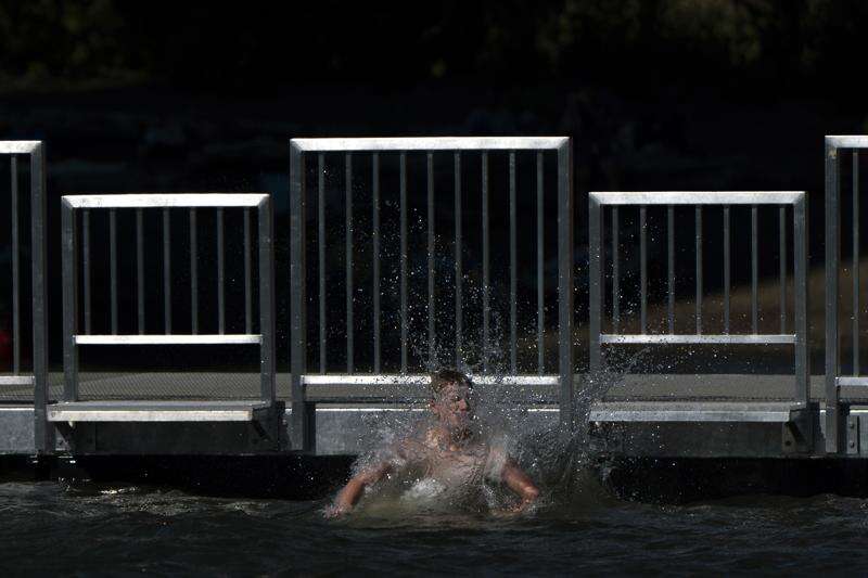 A child jumps off the dock at Cathedral City Park into the Willamette River on Friday, July 5, 2024, in Portland, Ore. A slow-moving and potentially record-setting heat wave is spreading across the Western U.S., sending many residents in search of a cool haven from the dangerously high temperatures. (AP Photo/Jenny Kane)