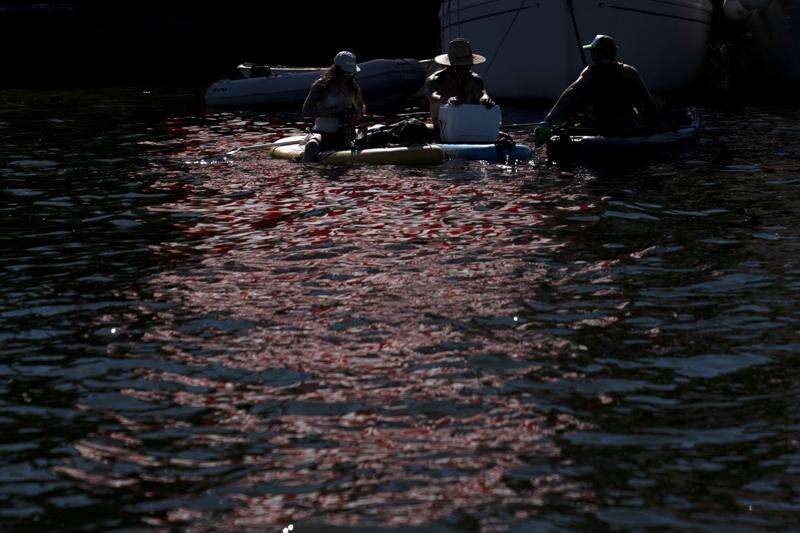 With an American flag reflected in the Willamette River, people sit on their paddle boards and listen to the music at the Waterfront Blues Festival on Friday, July 5, 2024, in Portland, Ore. A slow-moving and potentially record-setting heat wave is spreading across the Western U.S., sending many residents in search of a cool haven from the dangerously high temperatures. (AP Photo/Jenny Kane)