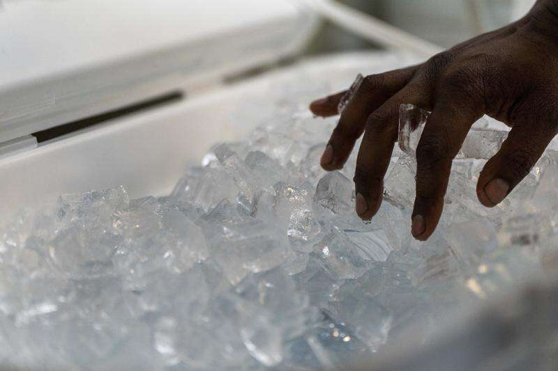 Ty Brown, with Cultivate Initiatives, puts ice over bottles of water as workers set up the Cook Plaza cooling center on Friday, July 5, 2024, in Gresham, Ore. A heat wave is spreading across Wester U.S., the National Weather Service said, sending many residents in search of a cool haven from the dangerously high temperatures. (AP Photo/Jenny Kane)