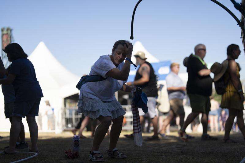 Gina Rowlett uses the mister to cool off at the Waterfront Blues Festival on Friday, July 5, 2024, in Portland, Ore. A slow-moving and potentially record-setting heat wave is spreading across the Western U.S., sending many residents in search of a cool haven from the dangerously high temperatures. (AP Photo/Jenny Kane)