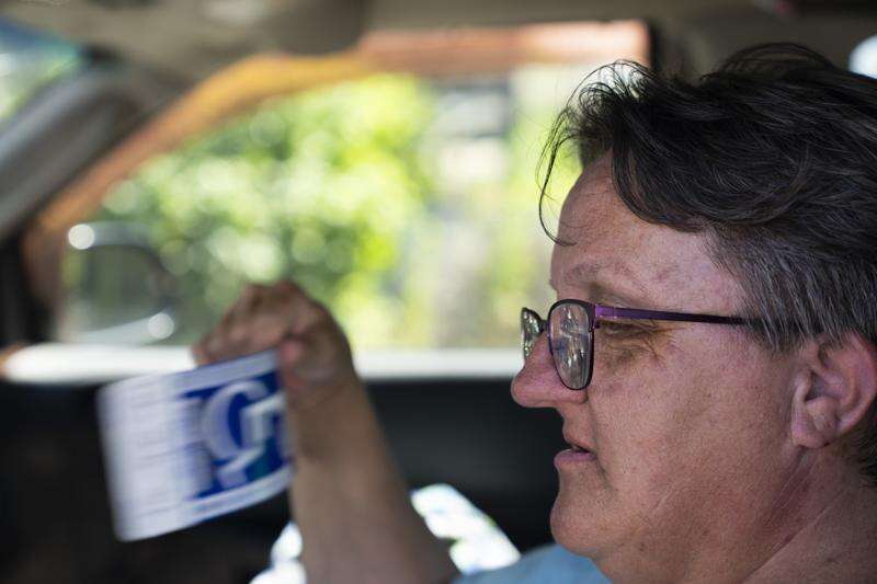Sherri Thompson uses her disability parking sign to fan off as she waits for the Cook Plaza cooling center to open on Friday, July 5, 2024, in Gresham, Ore. Thompson has lived in her car for three years, and can only run its air conditioning for about 20 minutes at a time as it causes the engine to overheat. A heat wave is spreading across Wester U.S., the National Weather Service said, sending many residents in search of a cool haven from the dangerously high temperatures. (AP Photo/Jenny Kane)