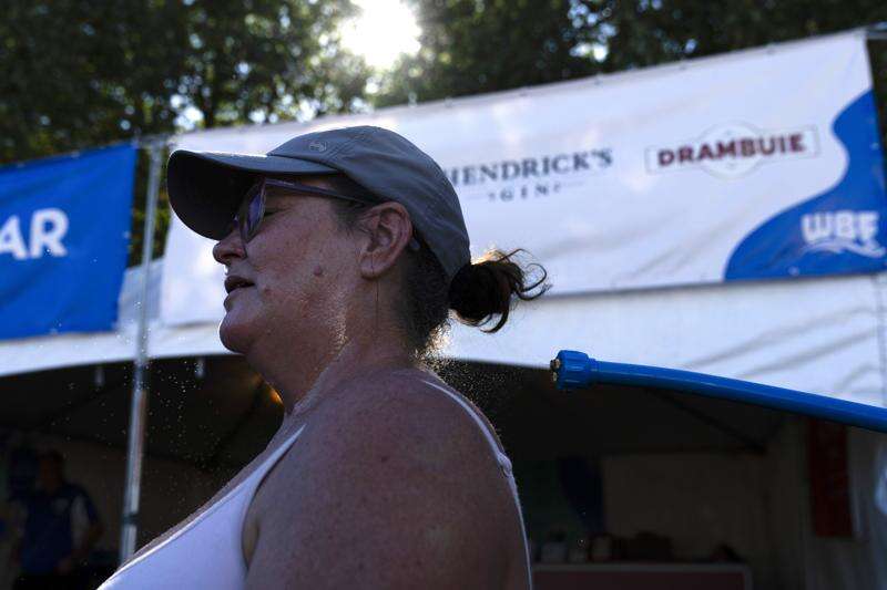 Corinne Dickey, of Portland, Ore., cools off under a mister while attending the Waterfront Blues Festival on Friday, July 5, 2024, in Portland, Ore. A slow-moving and potentially record-setting heat wave is spreading across the Western U.S., sending many residents in search of a cool haven from the dangerously high temperatures. (AP Photo/Jenny Kane)